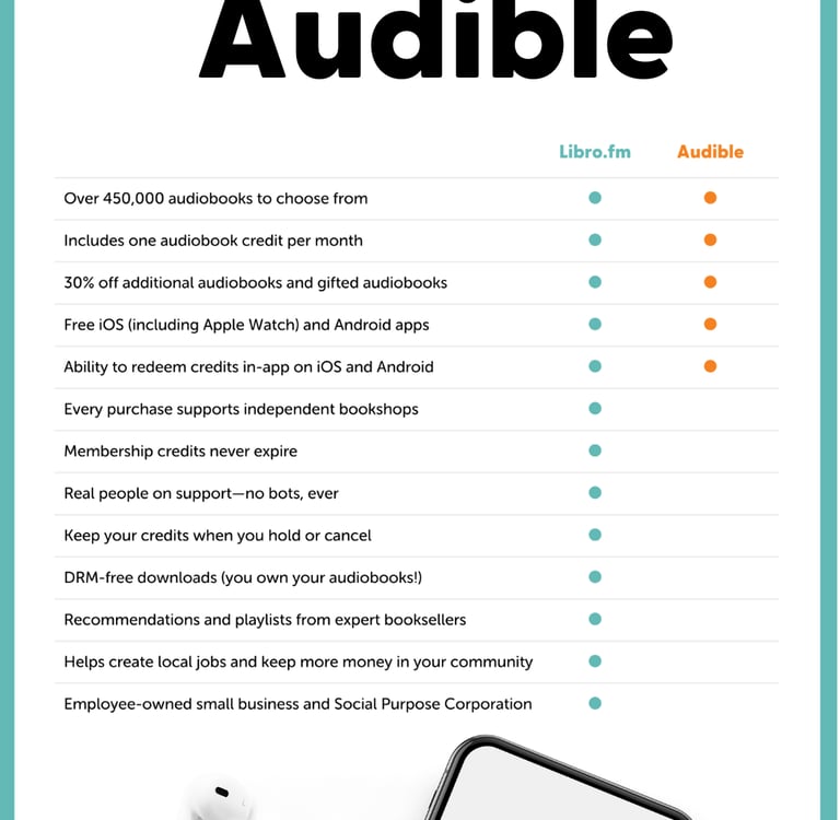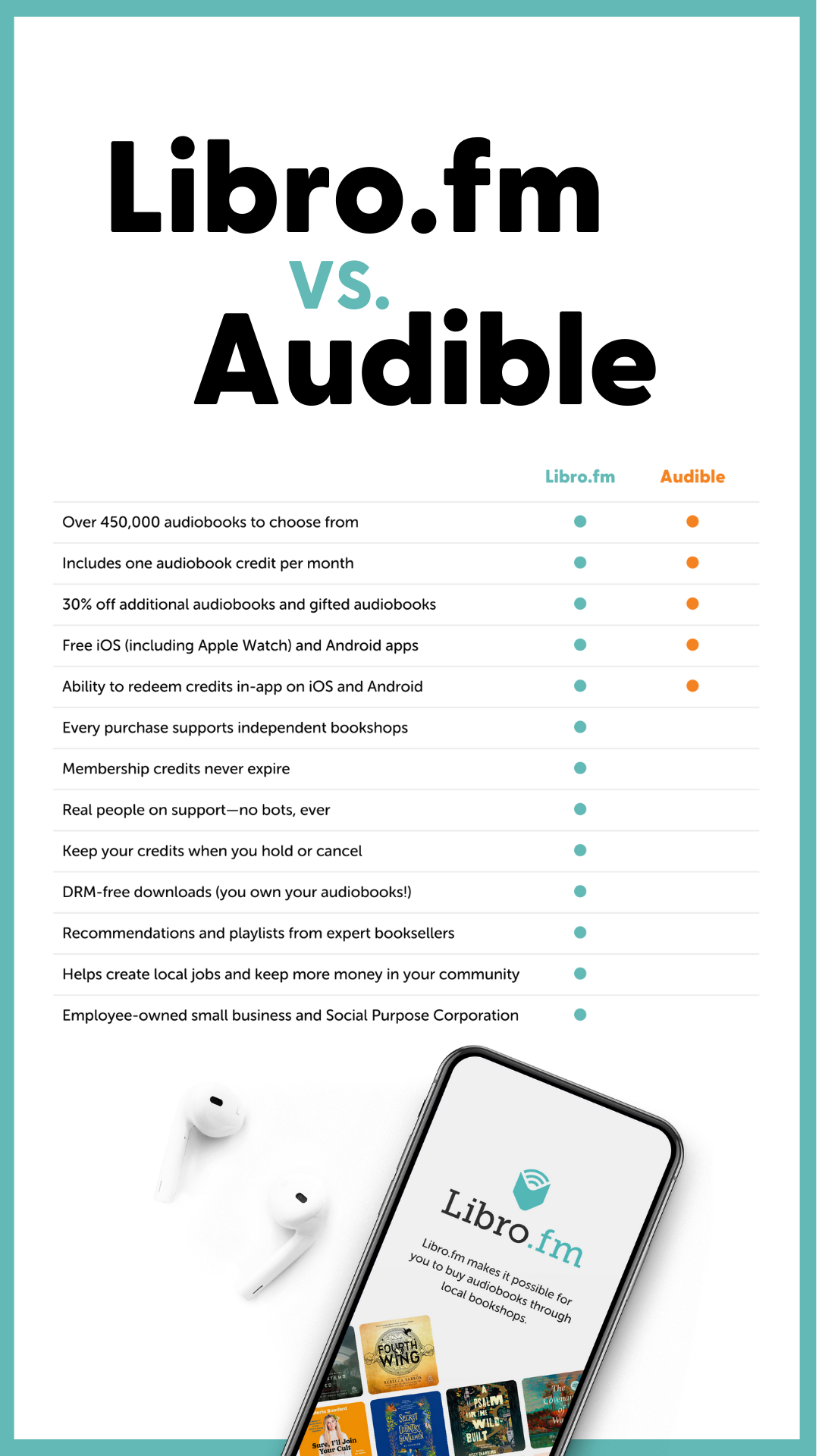 Already using another popular audiobook service and need a reason to switch? Check out the comparison below to see what Libro.fm gets you. Our favorite perk? These are DRM-free downloads, meaning you actually own your audiobooks.