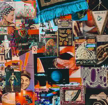 For this workshop, we'll focus on collaging not only in 2-D, but adding in 3-D textures and elements -- even pop-ups, windows, and off-the-page embellishments!