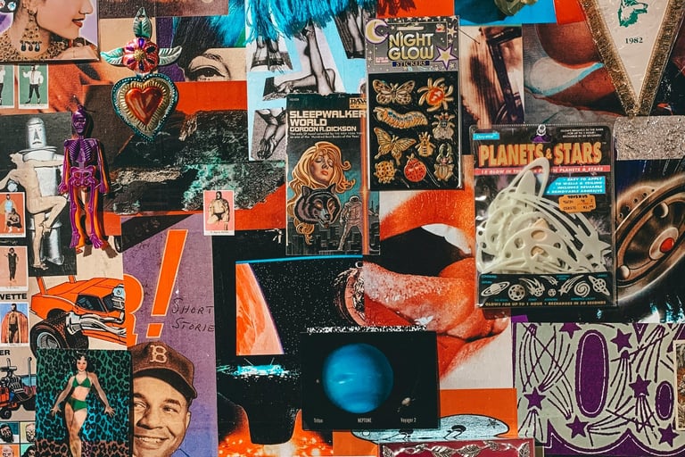Collaging is the art of mixing various media to form new works. That can include cut outs from magazines, old books, scraps of paper found, but also larger objects or knick knacks.